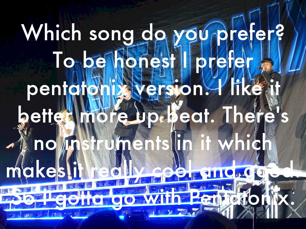 To be honest I prefer pentatonix version. I like it better more up beat. There's no instruments in it which makes it really cool and good. So I gotta go with Pentatonix.