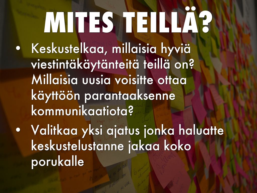 Keskustelkaa, millaisia hyviä viestintäkäytänteitä teillä on? Millaisia uusia voisitte ottaa käyttöön parantaaksenne kommunikaatiota?