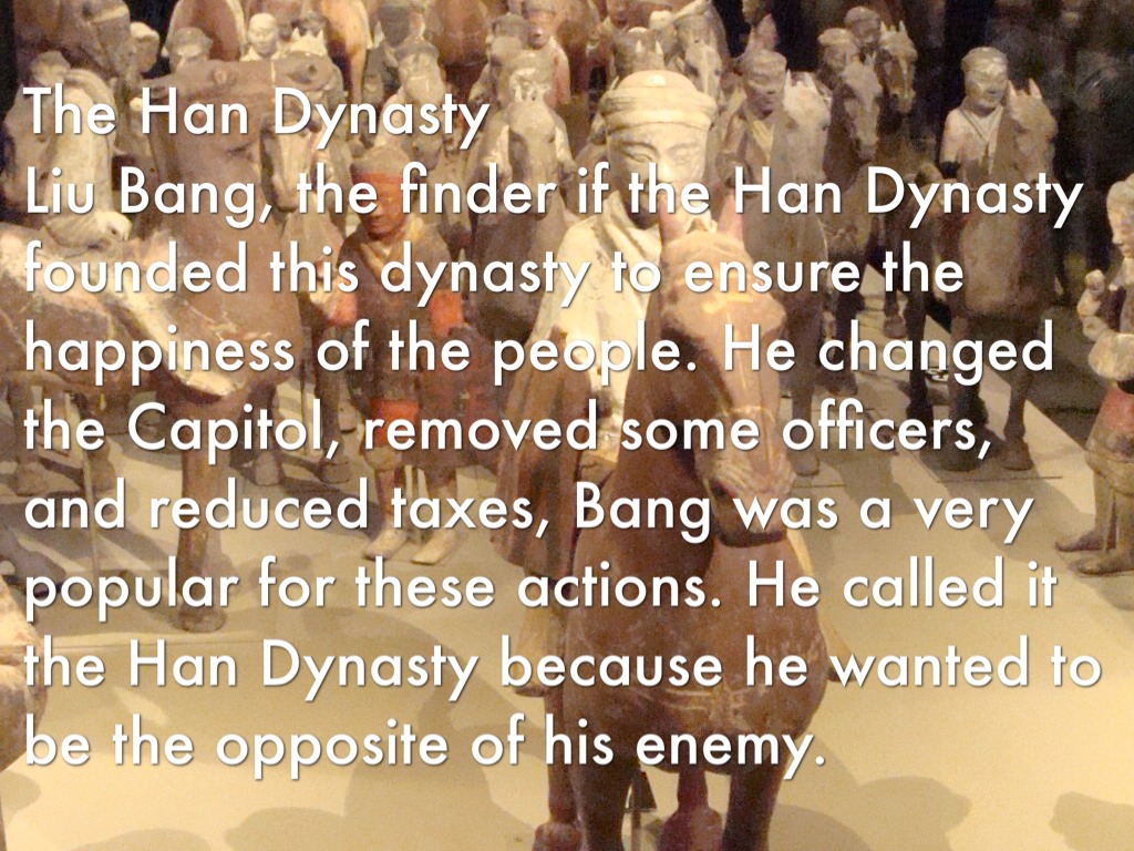 Liu Bang, the finder if the Han Dynasty founded this dynasty to ensure the happiness of the people. He changed the Capitol, removed some officers, and reduced taxes, Bang was a very popular for these actions. He called it the Han Dynasty because he wanted to be the opposite of his enemy.