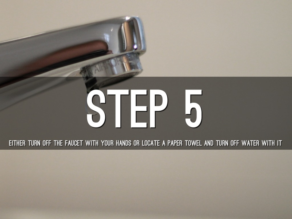 EITHER TURN OFF THE FAUCET WITH YOUR HANDS OR LOCATE A PAPER TOWEL AND TURN OFF WATER WITH IT