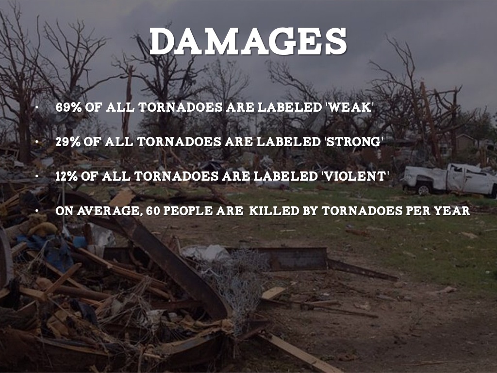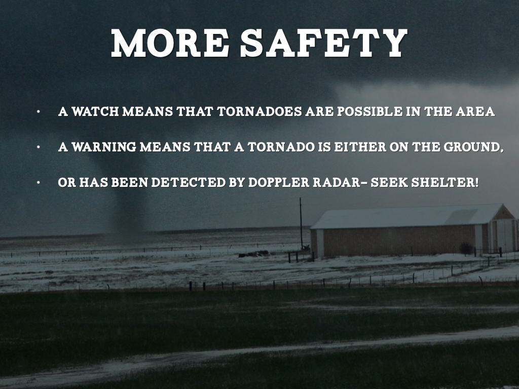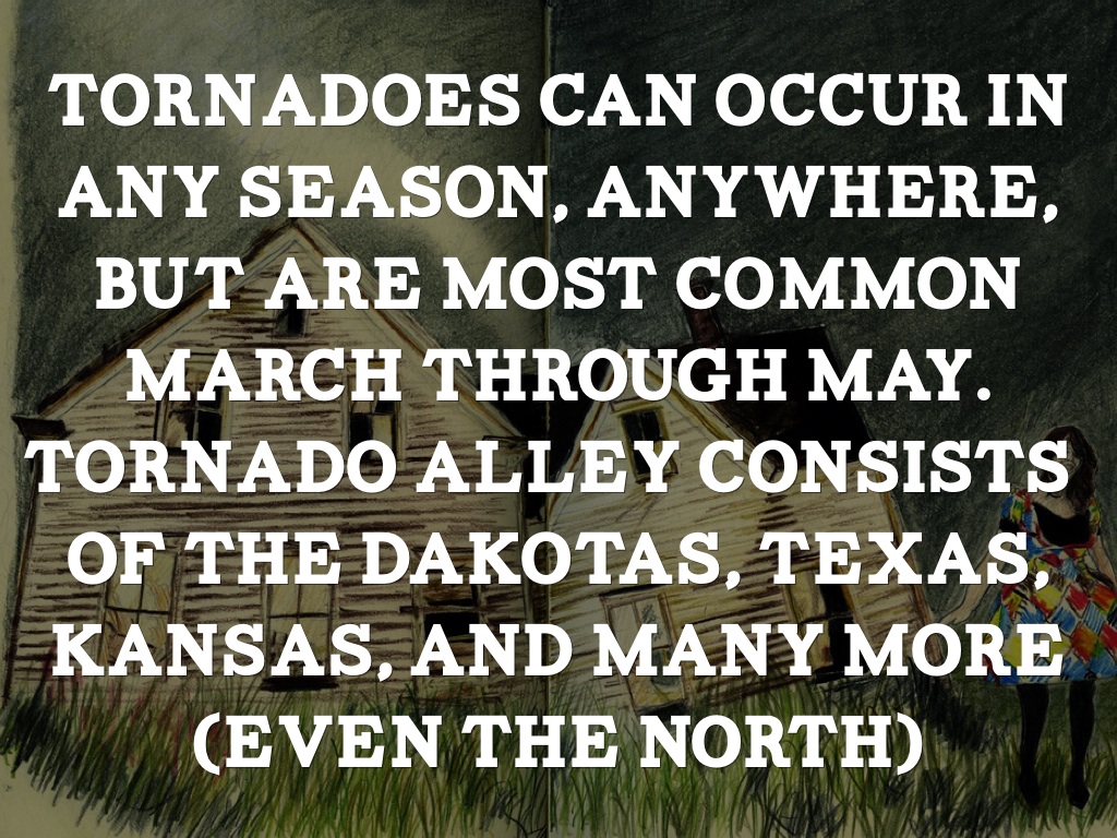 Tornadoes can occur in any season, anywhere, but are most common march through May. Tornado alley consists of the Dakotas, texas, Kansas, and many more (even the north)