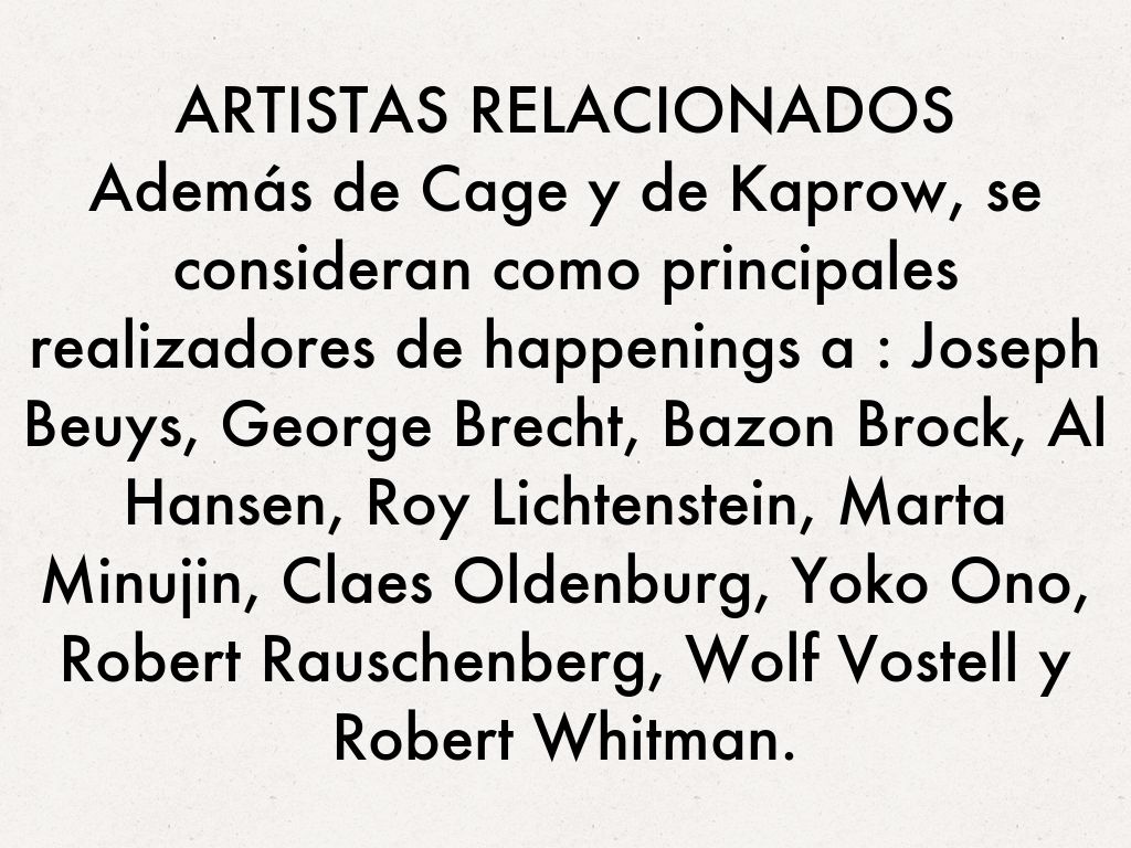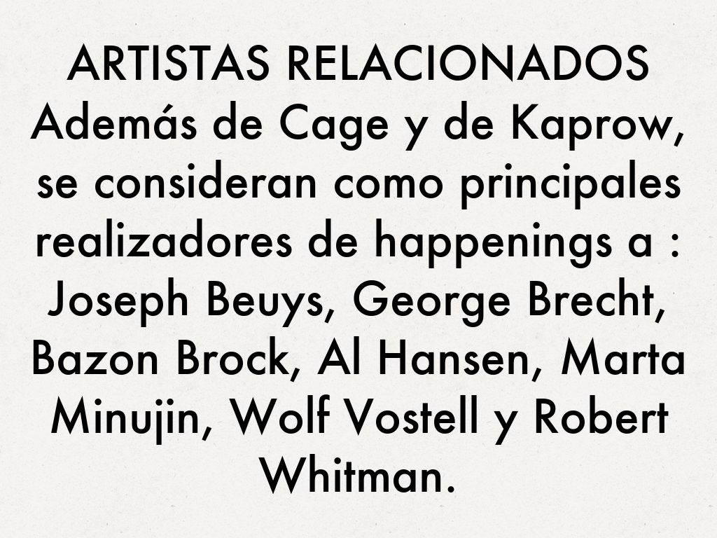 Además de Cage y de Kaprow, se consideran como principales realizadores de happenings a : Joseph Beuys, George Brecht, Bazon Brock, Al Hansen, Marta Minujin, Wolf Vostell y Robert Whitman.