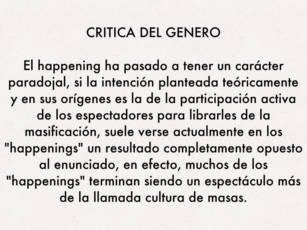 El happening ha pasado a tener un carácter paradojal, si la intención planteada teóricamente y en sus orígenes es la de la participación activa de los espectadores para librarles de la masificación, suele verse actualmente en los "happenings" un resultado completamente opuesto al enunciado, en efecto, muchos de los "happenings" terminan siendo un espectáculo más de la llamada cultura de masas.
