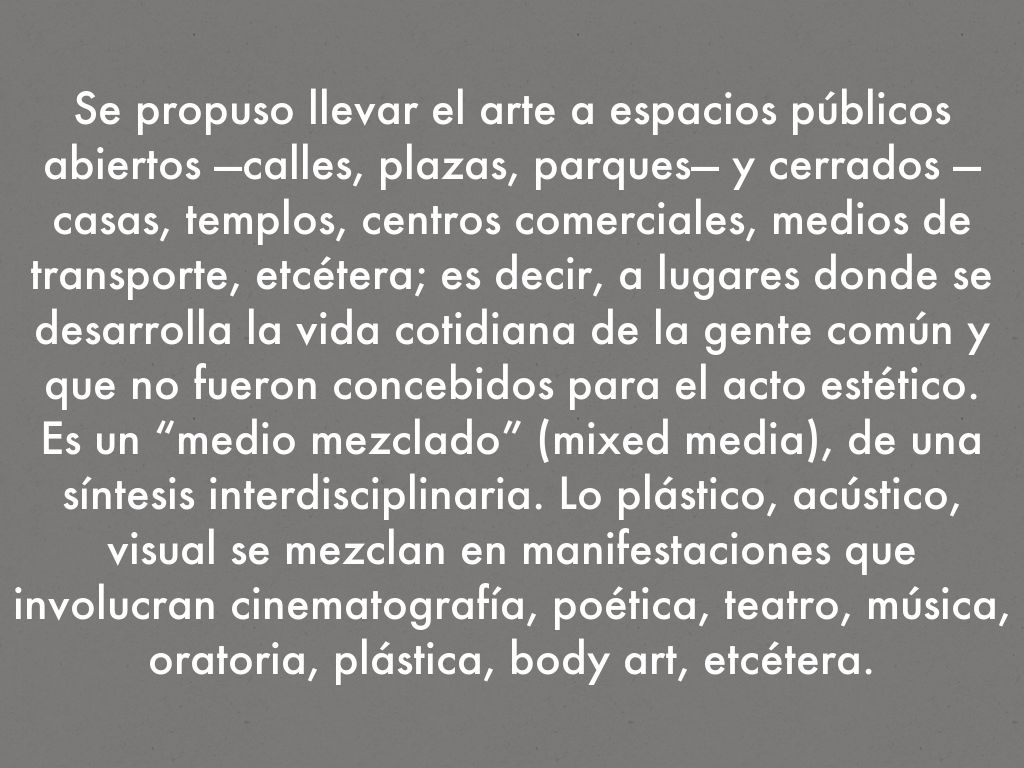 Se propuso llevar el arte a espacios públicos abiertos —calles, plazas, parques— y cerrados —casas, templos, centros comerciales, medios de transporte, etcétera; es decir, a lugares donde se desarrolla la vida cotidiana de la gente común y que no fueron concebidos para el acto estético.