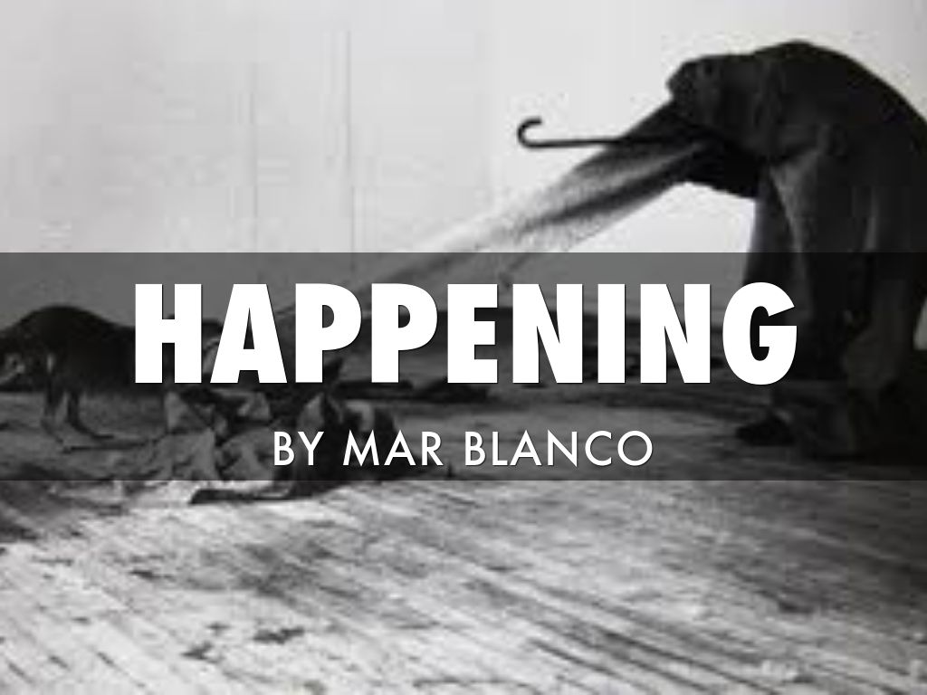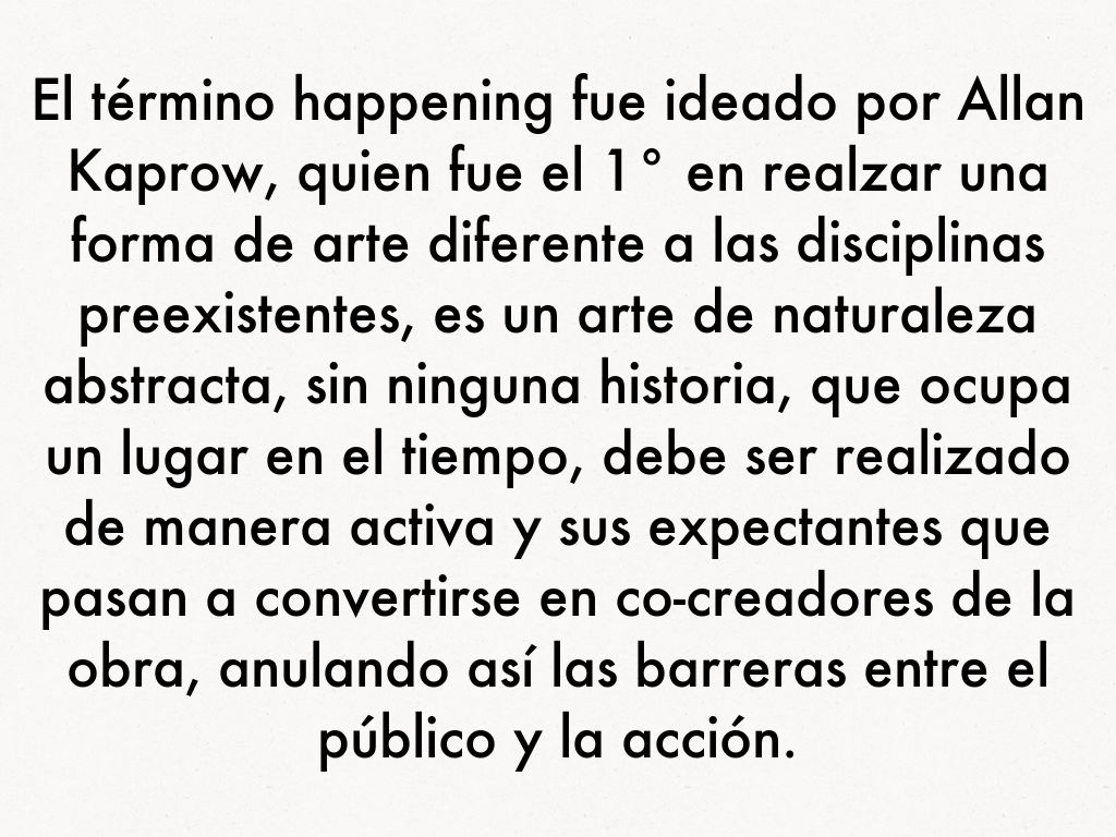 El término happening fue ideado por Allan Kaprow, quien fue el 1° en realzar una forma de arte diferente a las disciplinas preexistentes, es un arte de naturaleza abstracta, sin ninguna historia, que ocupa un lugar en el tiempo, debe ser realizado de manera activa y sus expectantes que pasan a convertirse en co-creadores de la obra, anulando así las barreras entre el público y la acción.