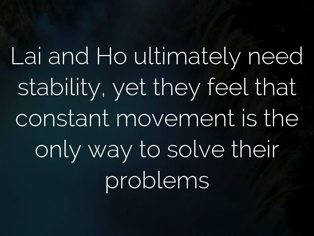 Lai and Ho ultimately need stability, yet they feel that constant movement is the only way to solve their problems