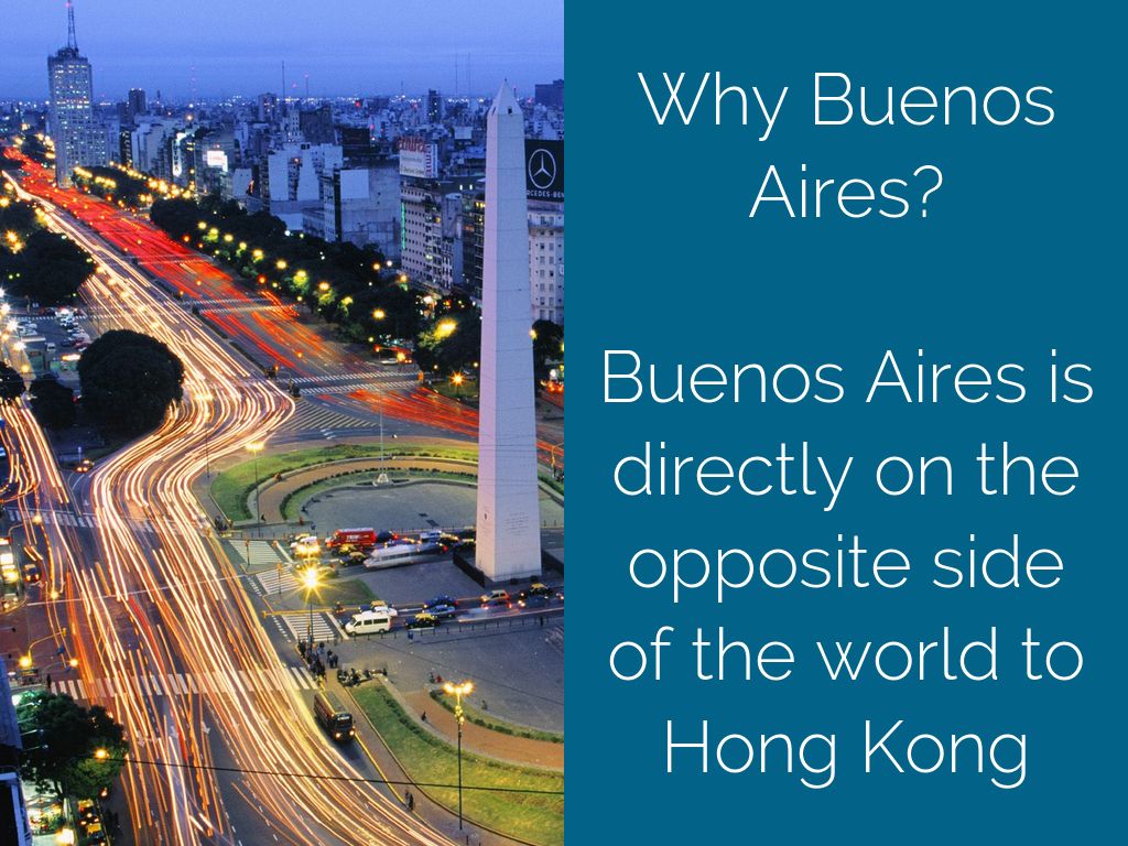 Buenos Aires is directly on the opposite side of the world to Hong Kong