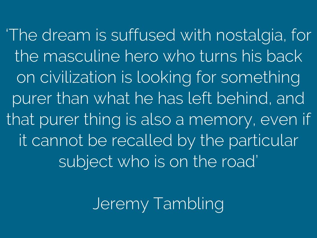‘The dream is suffused with nostalgia, for the masculine hero who turns his back on civilization is looking for something purer than what he has left behind, and that purer thing is also a memory, even if it cannot be recalled by the particular subject who is on the road’