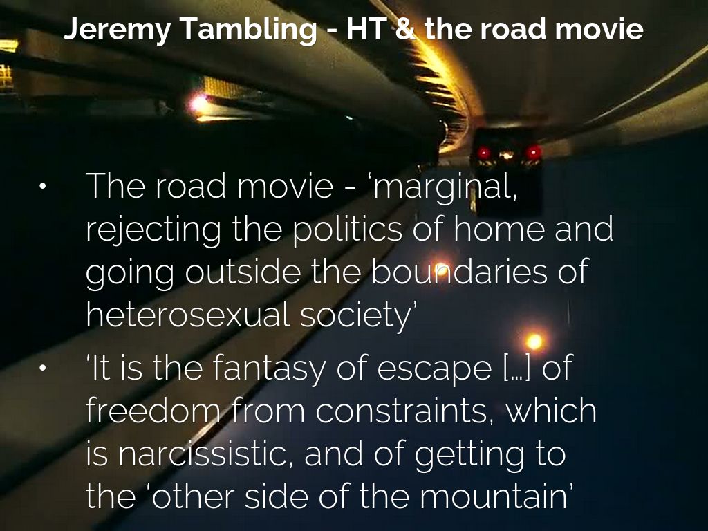 - The road movie - ‘marginal, rejecting the politics of home and going outside the boundaries of heterosexual society’