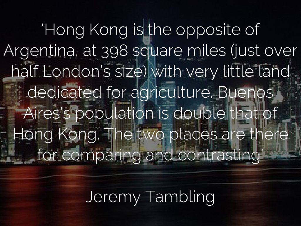 ‘Hong Kong is the opposite of Argentina, at 398 square miles (just over half London’s size) with very little land dedicated for agriculture. Buenos Aires’s population is double that of Hong Kong. The two places are there for comparing and contrasting’