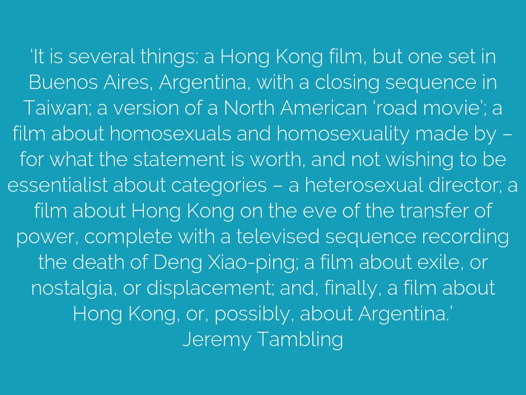 ‘It is several things: a Hong Kong film, but one set in Buenos Aires, Argentina, with a closing sequence in Taiwan; a version of a North American ‘road movie’; a film about homosexuals and homosexuality made by – for what the statement is worth, and not wishing to be essentialist about categories – a heterosexual director; a film about Hong Kong on the eve of the transfer of power, complete with a televised sequence recording the death of Deng Xiao-ping; a film about exile, or nostalgia, or displacement; and, finally, a film about Hong Kong, or, possibly, about Argentina.’