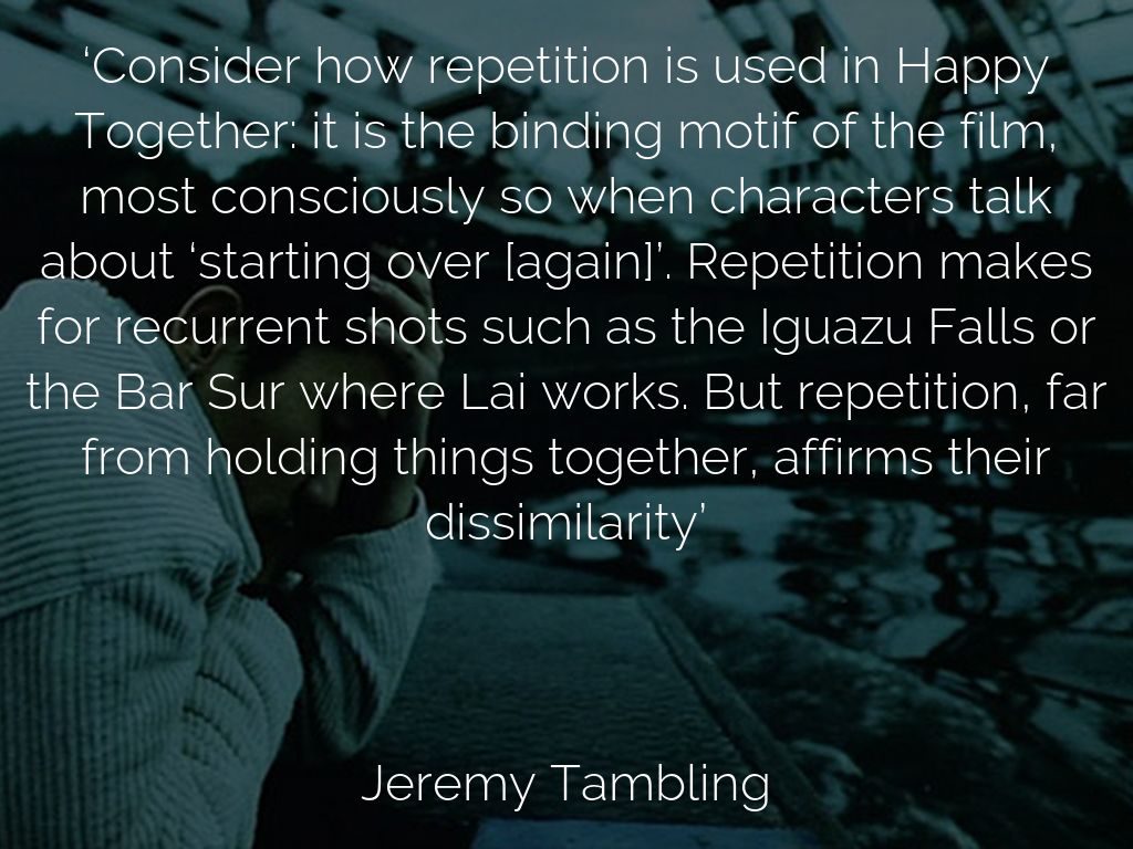 ‘Consider how repetition is used in Happy Together: it is the binding motif of the film, most consciously so when characters talk about ‘starting over [again]’. Repetition makes for recurrent shots such as the Iguazu Falls or the Bar Sur where Lai works. But repetition, far from holding things together, affirms their dissimilarity’