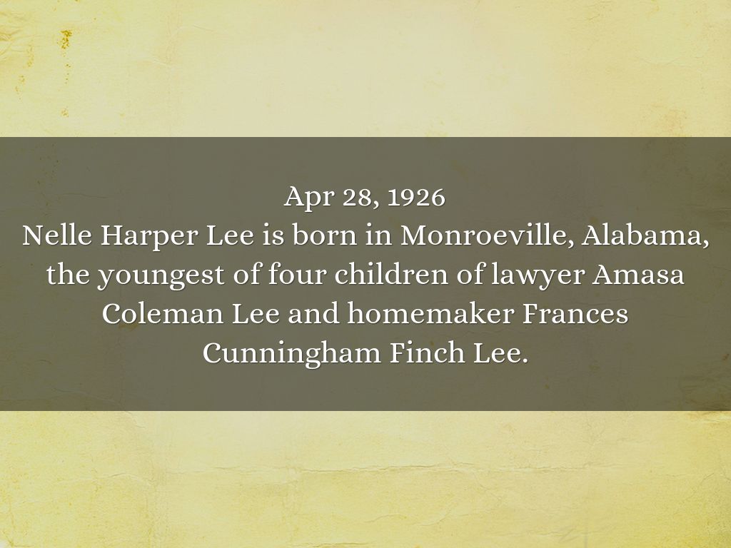 Apr 28, 1926 Nelle Harper Lee is born in Monroeville, Alabama, the youngest of four children of lawyer Amasa Coleman Lee and homemaker Frances Cunningham Finch Lee.