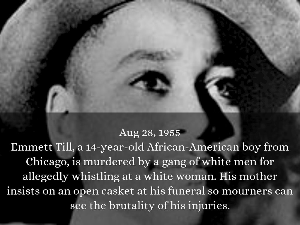 Aug 28, 1955 Emmett Till, a 14-year-old African-American boy from Chicago, is murdered by a gang of white men for allegedly whistling at a white woman. His mother insists on an open casket at his funeral so mourners can see the brutality of his injuries.