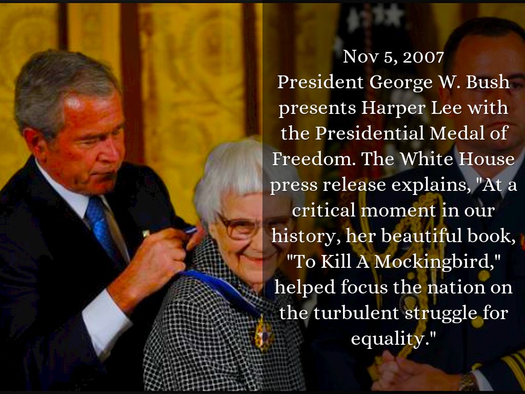 Nov 5, 2007 President George W. Bush presents Harper Lee with the Presidential Medal of Freedom. The White House press release explains, "At a critical moment in our history, her beautiful book, "To Kill A Mockingbird," helped focus the nation on the turbulent struggle for equality."