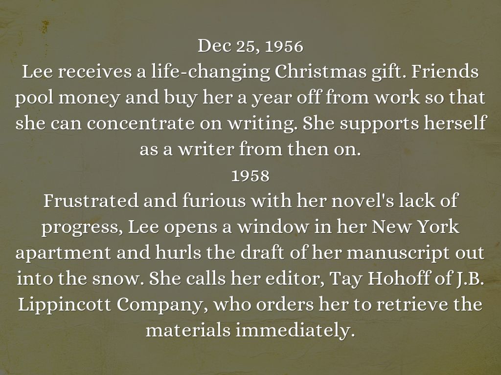 Dec 25, 1956 Lee receives a life-changing Christmas gift. Friends pool money and buy her a year off from work so that she can concentrate on writing. She supports herself as a writer from then on. 1958 Frustrated and furious with her novel's lack of progress, Lee opens a window in her New York apartment and hurls the draft of her manuscript out into the snow. She calls her editor, Tay Hohoff of J.B. Lippincott Company, who orders her to retrieve the materials immediately.