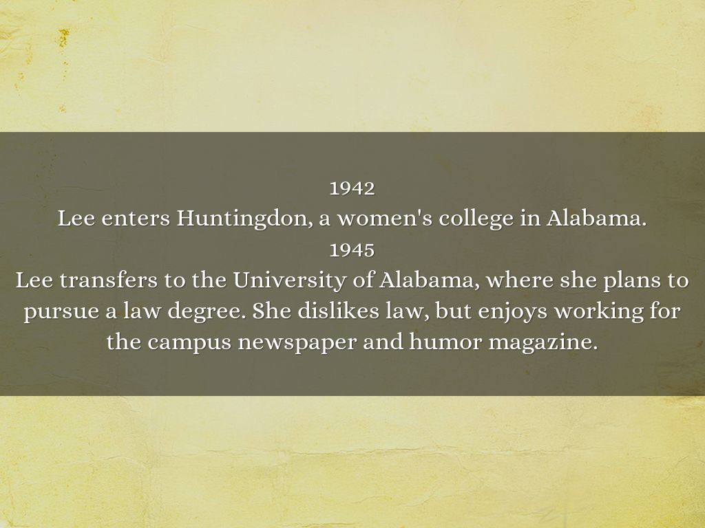1942 Lee enters Huntingdon, a women's college in Alabama. 1945 Lee transfers to the University of Alabama, where she plans to pursue a law degree. She dislikes law, but enjoys working for the campus newspaper and humor magazine.