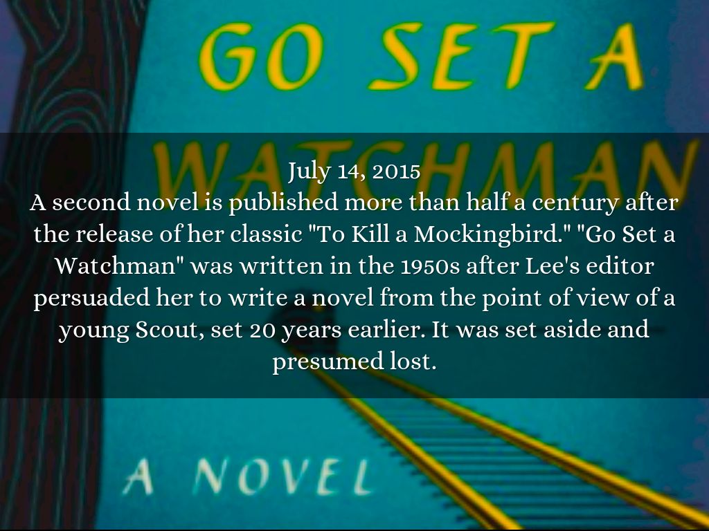 July 14, 2015 A second novel is published more than half a century after the release of her classic "To Kill a Mockingbird." "Go Set a Watchman" was written in the 1950s after Lee's editor persuaded her to write a novel from the point of view of a young Scout, set 20 years earlier. It was set aside and presumed lost.