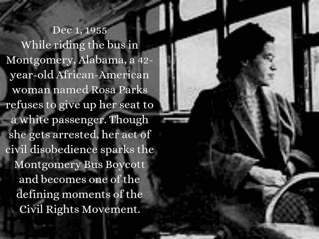 Dec 1, 1955 While riding the bus in Montgomery, Alabama, a 42-year-old African-American woman named Rosa Parks refuses to give up her seat to a white passenger. Though she gets arrested, her act of civil disobedience sparks the Montgomery Bus Boycott and becomes one of the defining moments of the Civil Rights Movement.