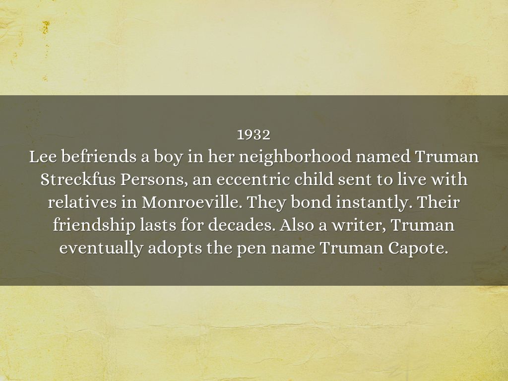 1932 Lee befriends a boy in her neighborhood named Truman Streckfus Persons, an eccentric child sent to live with relatives in Monroeville. They bond instantly. Their friendship lasts for decades. Also a writer, Truman eventually adopts the pen name Truman Capote.