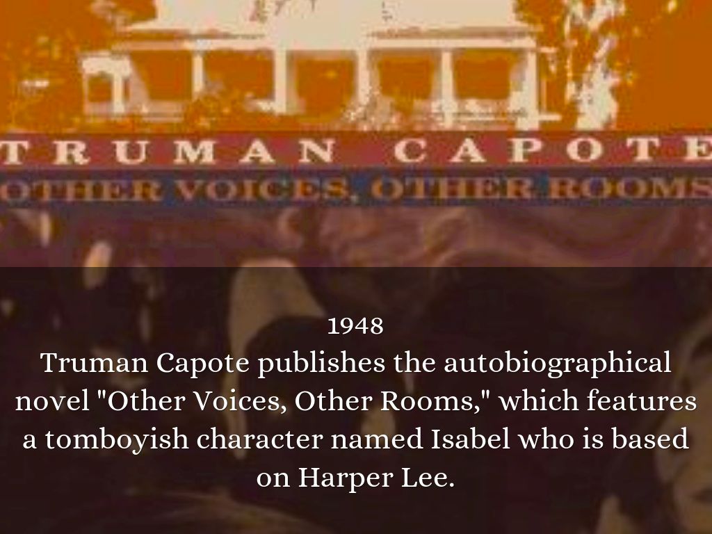 1948 Truman Capote publishes the autobiographical novel "Other Voices, Other Rooms," which features a tomboyish character named Isabel who is based on Harper Lee.