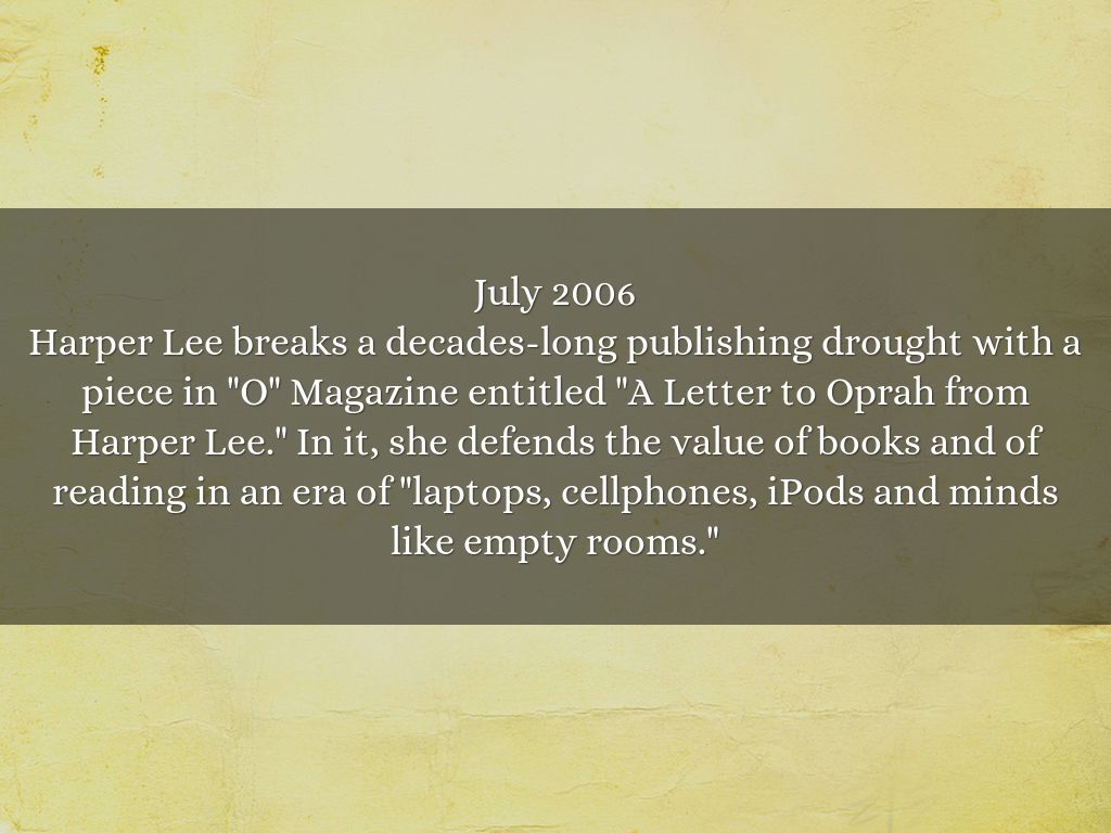 July 2006 Harper Lee breaks a decades-long publishing drought with a piece in "O" Magazine entitled "A Letter to Oprah from Harper Lee." In it, she defends the value of books and of reading in an era of "laptops, cellphones, iPods and minds like empty rooms."