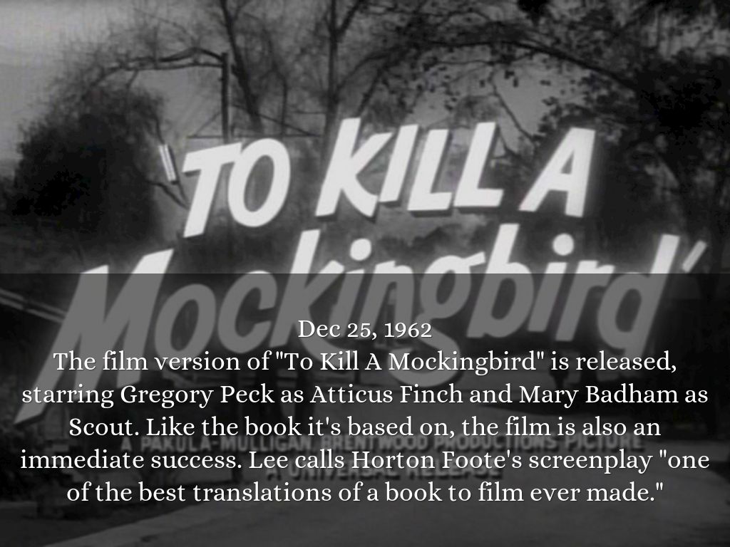 Dec 25, 1962 The film version of "To Kill A Mockingbird" is released, starring Gregory Peck as Atticus Finch and Mary Badham as Scout. Like the book it's based on, the film is also an immediate success. Lee calls Horton Foote's screenplay "one of the best translations of a book to film ever made."