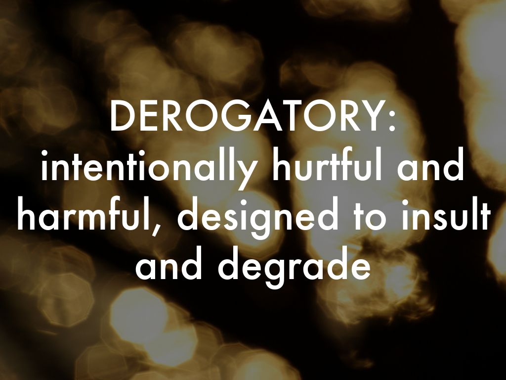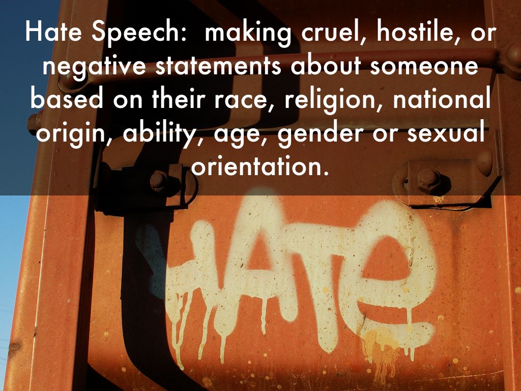 Hate Speech: making cruel, hostile, or negative statements about someone based on their race, religion, national origin, ability, age, gender or sexual orientation.