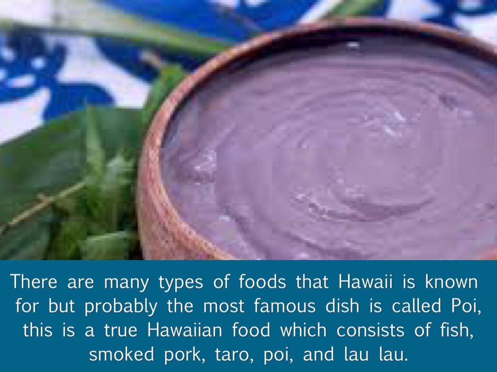 There are many types of foods that Hawaii is known for but probably the most famous dish is called Poi, this is a true Hawaiian food which consists of fish, smoked pork, taro, poi, and lau lau.
