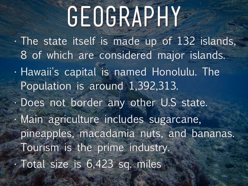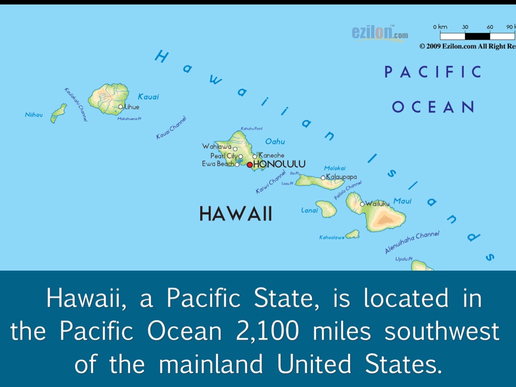 Hawaii, a Pacific State, is located in the Pacific Ocean 2,100 miles southwest of the mainland United States.