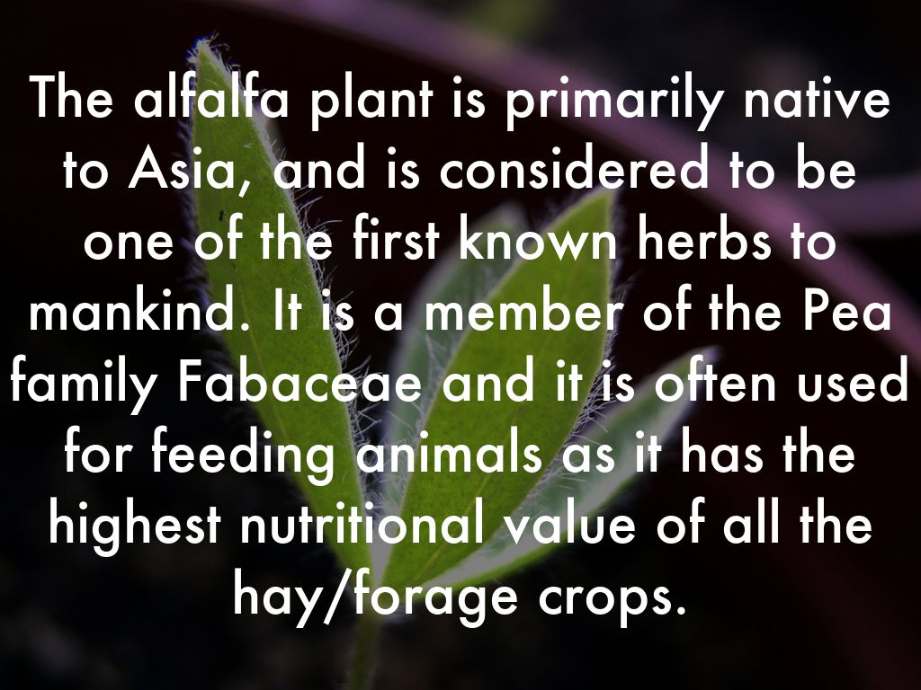 The alfalfa plant is primarily native to Asia, and is considered to be one of the first known herbs to mankind. It is a member of the Pea family Fabaceae and it is often used for feeding animals as it has the highest nutritional value of all the hay/forage crops.