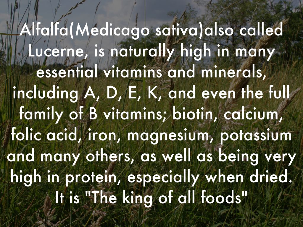 Alfalfa(Medicago sativa)also called Lucerne, is naturally high in many essential vitamins and minerals, including A, D, E, K, and even the full family of B vitamins; biotin, calcium, folic acid, iron, magnesium, potassium and many others, as well as being very high in protein, especially when dried. It is "The king of all foods"