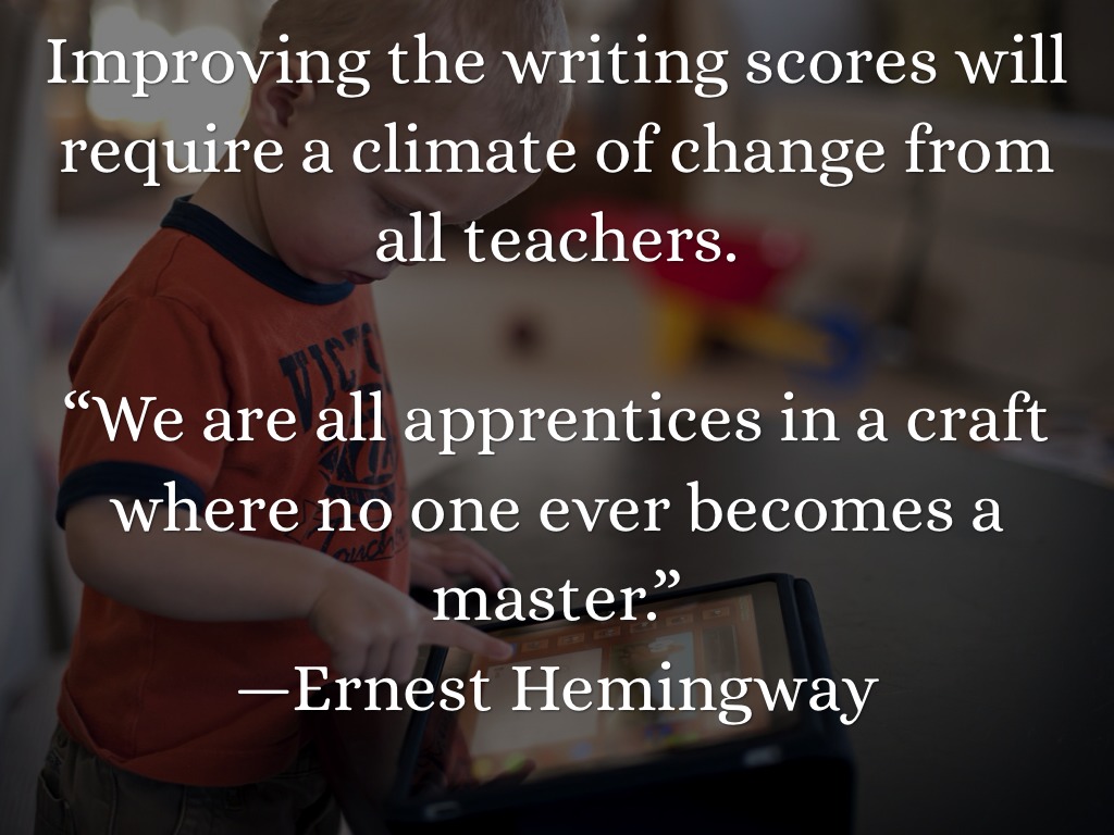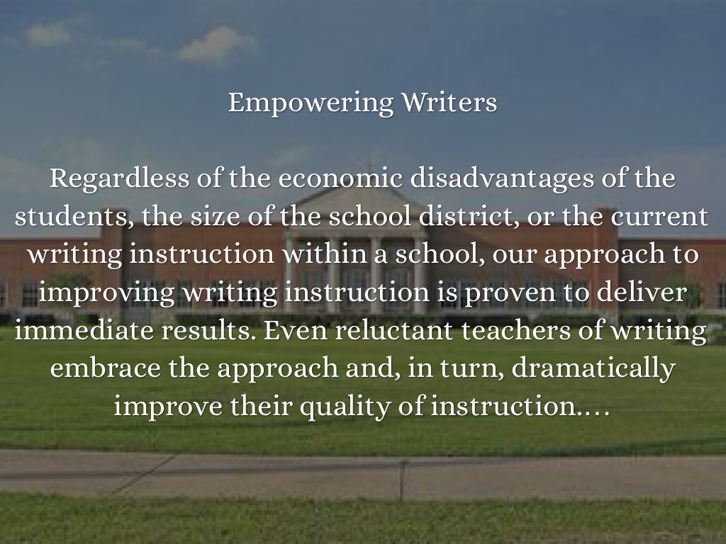 Regardless of the economic disadvantages of the students, the size of the school district, or the current writing instruction within a school, our approach to improving writing instruction is proven to deliver immediate results. Even reluctant teachers of writing embrace the approach and, in turn, dramatically improve their quality of instruction.
