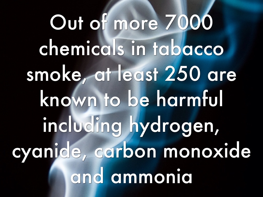 Out of more 7000 chemicals in tabacco smoke, at least 250 are known to be harmful including hydrogen, cyanide, carbon monoxide and ammonia