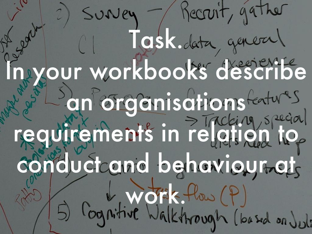 In your workbooks describe an organisations requirements in relation to conduct and behaviour at work.