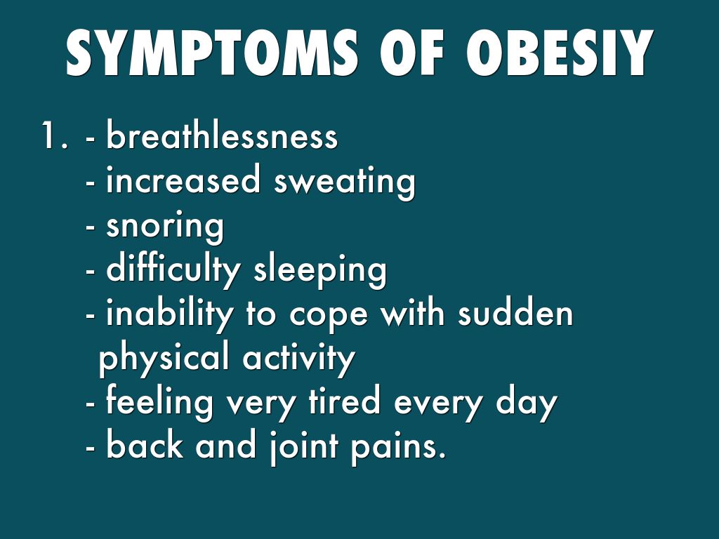 - breathlessness - increased sweating - snoring - difficulty sleeping - inability to cope with sudden physical activity - feeling very tired every day - back and joint pains.