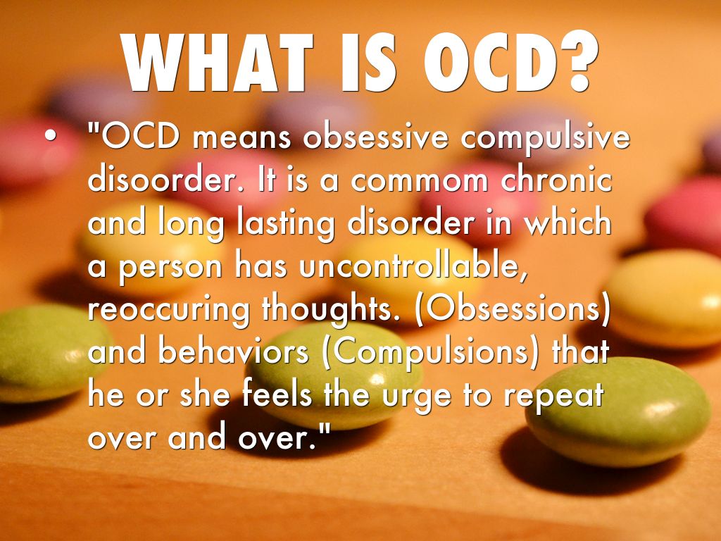 "OCD means obsessive compulsive disoorder. It is a commom chronic and long lasting disorder in which a person has uncontrollable, reoccuring thoughts. (Obsessions) and behaviors (Compulsions) that he or she feels the urge to repeat over and over."