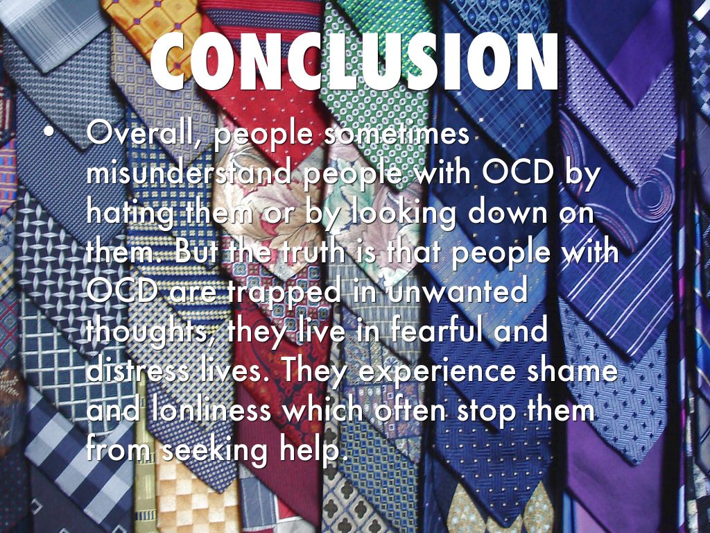 Overall, people sometimes misunderstand people with OCD by hating them or by looking down on them. But the truth is that people with OCD are trapped in unwanted thoughts, they live in fearful and distress lives. They experience shame and lonliness which often stop them from seeking help.