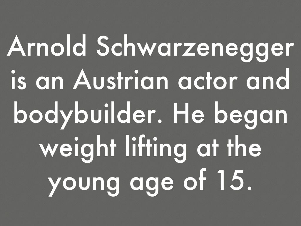 Arnold Schwarzenegger is an Austrian actor and bodybuilder. He began weight lifting at the young age of 15.