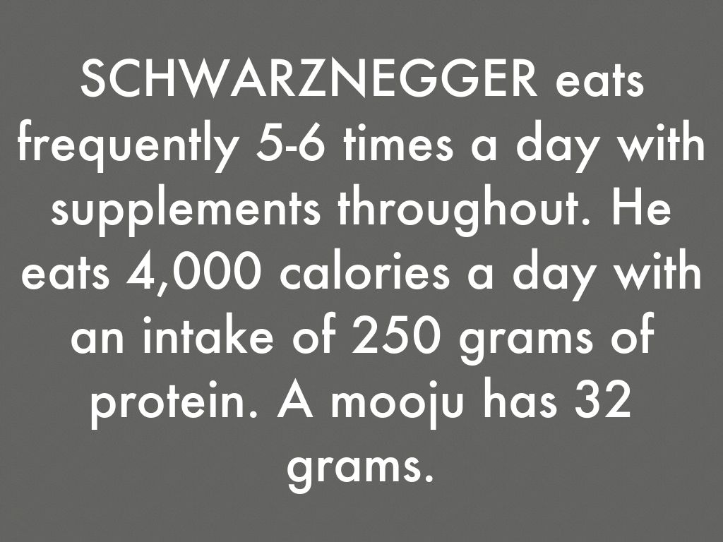 SCHWARZNEGGER eats frequently 5-6 times a day with supplements throughout. He eats 4,000 calories a day with an intake of 250 grams of protein. A mooju has 32 grams.