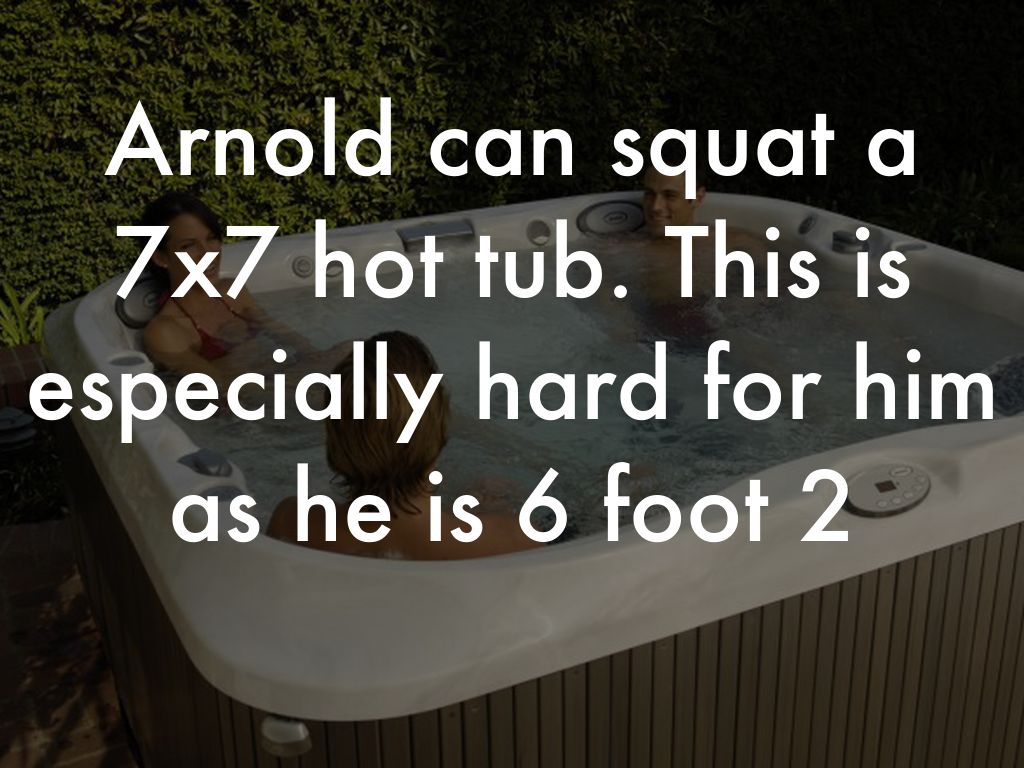 Arnold can squat a 7x7 hot tub. This is especially hard for him as he is 6 foot 2