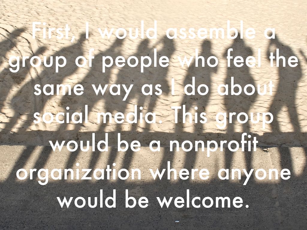 First, I would assemble a group of people who feel the same way as I do about social media. This group would be a nonprofit organization where anyone would be welcome.