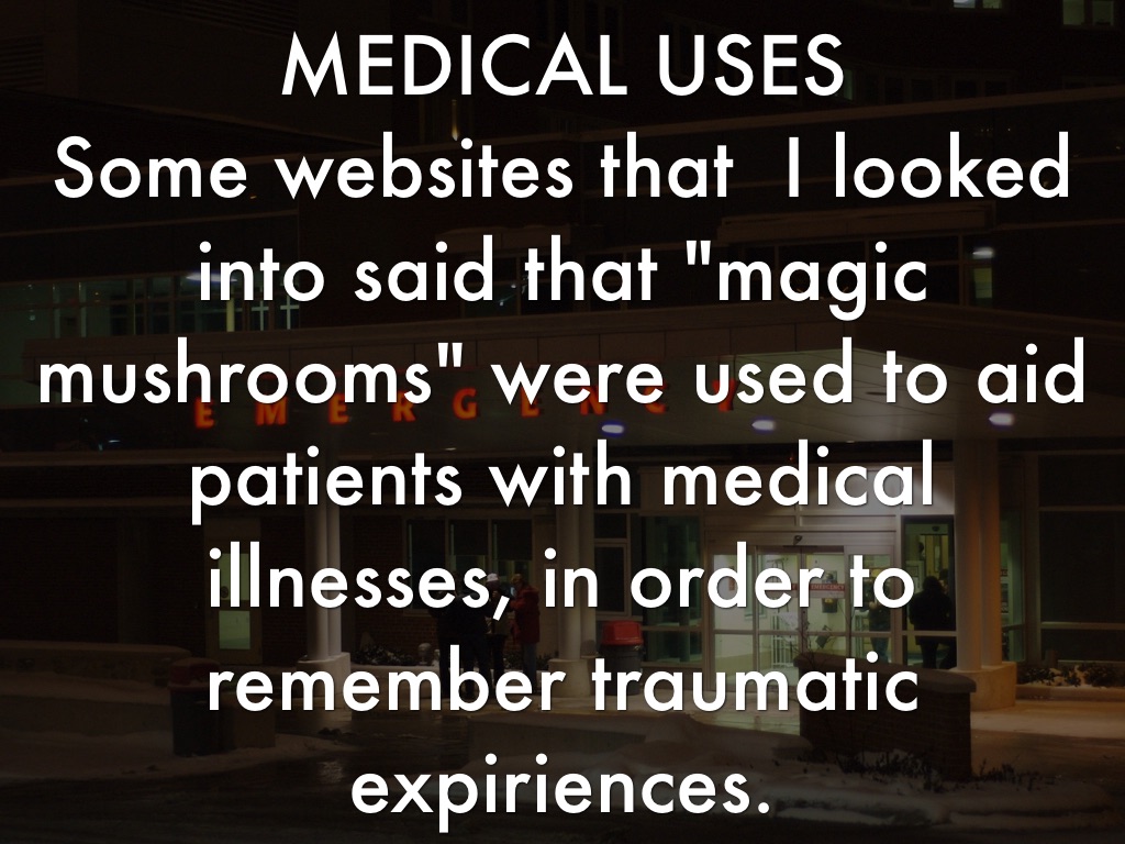 Some websites that I looked into said that "magic mushrooms" were used to aid patients with medical illnesses, in order to remember traumatic expiriences.