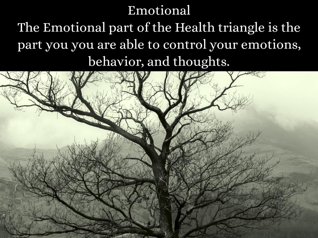 The Emotional part of the Health triangle is the part you you are able to control your emotions, behavior, and thoughts.