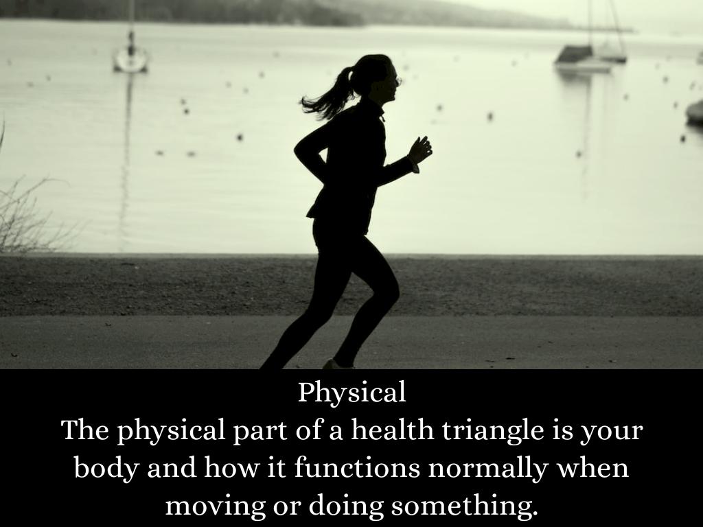 The physical part of a health triangle is your body and how it functions normally when moving or doing something.