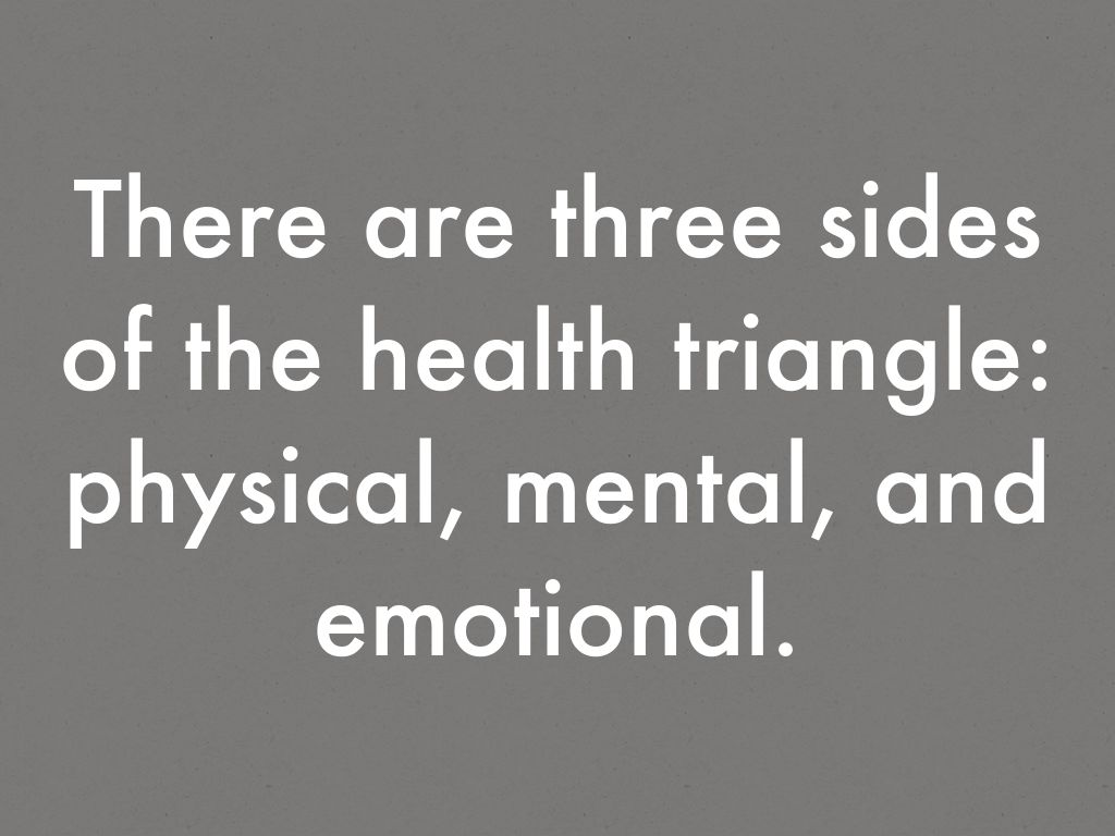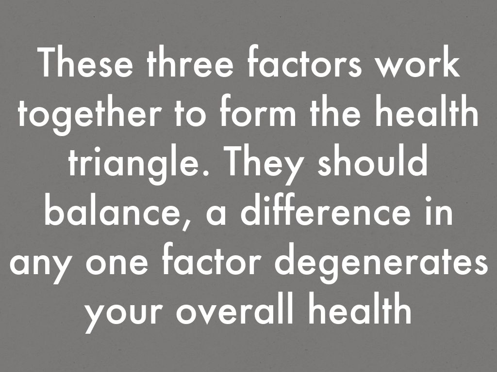 These three factors work together to form the health triangle. They should balance, a difference in any one factor degenerates your overall health