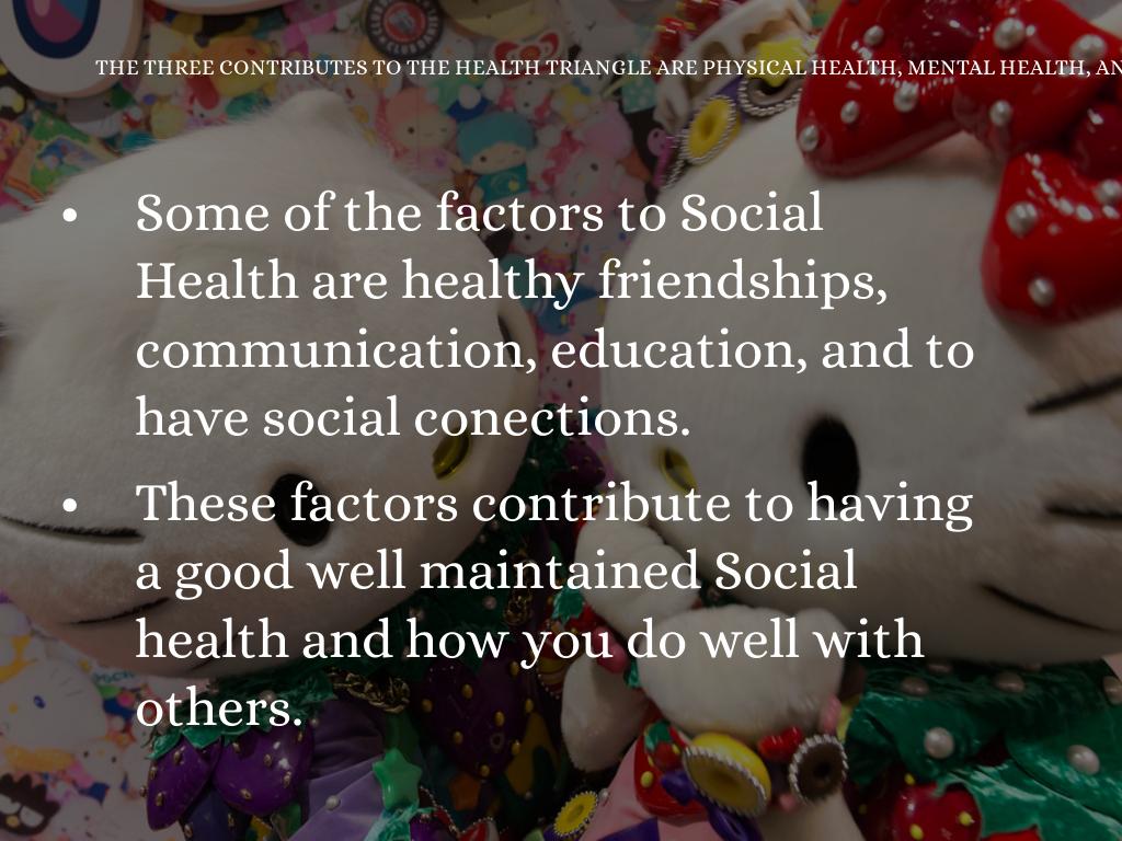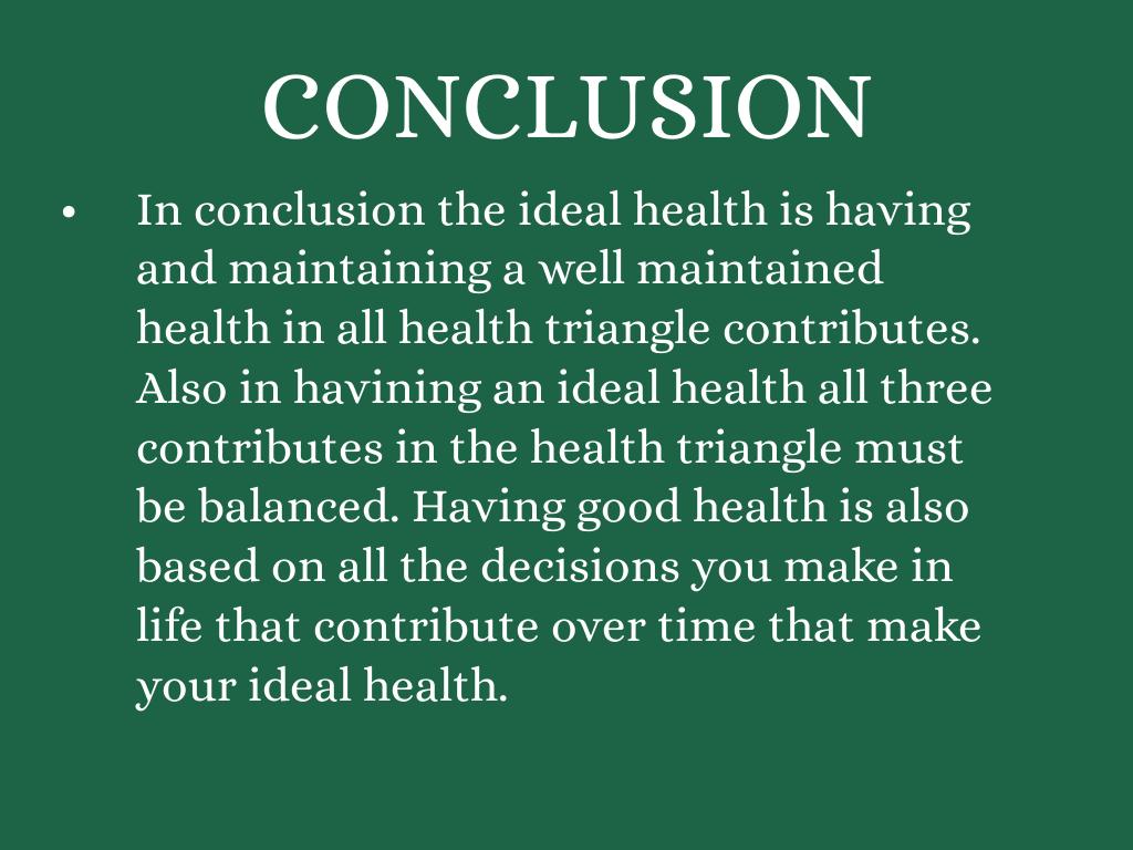 In conclusion the ideal health is having and maintaining a well maintained health in all health triangle contributes. Also in havining an ideal health all three contributes in the health triangle must be balanced. Having good health is also based on all the decisions you make in life that contribute over time that make your ideal health.