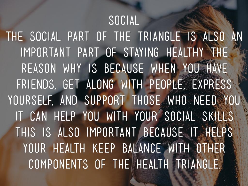 Social The social part of the triangle is also an important part of staying healthy the reason why is because when you have friends, get along with people, express yourself, and support those who need you it can help you with your social skills this is also important because it helps your health keep balance with other components of the health triangle.