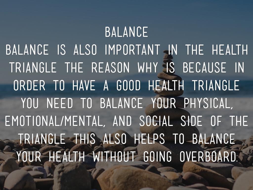 Balance Balance is also important in the health triangle the reason why is because in order to have a good health triangle you need to balance your physical, emotional/mental, and social side of the triangle this also helps to balance your health without going overboard.