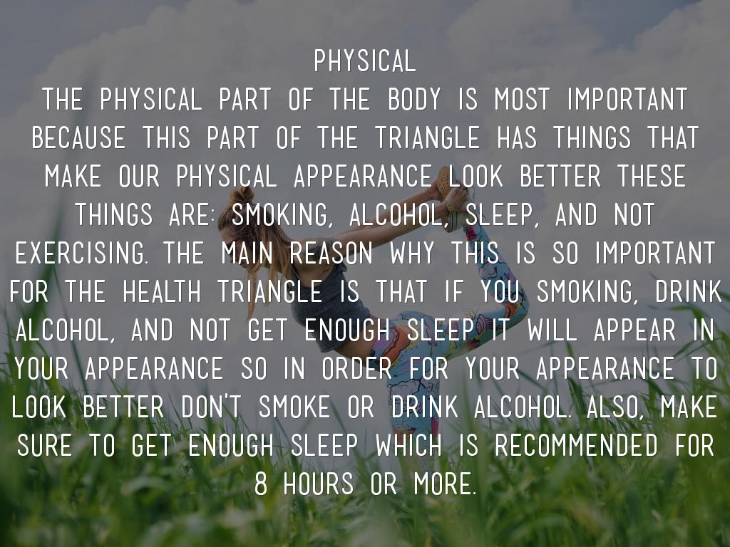 Physical The Physical part of the body is most important because this part of the triangle has things that make our physical appearance look better these things are: Smoking, Alcohol, Sleep, and not exercising. the main reason why this is so important for the health triangle is that if you smoking, drink alcohol, and not get enough sleep it will appear in your appearance so in order for your appearance to look better don't smoke or drink alcohol. Also, make sure to get enough sleep which is recommended for 8 hours or more.